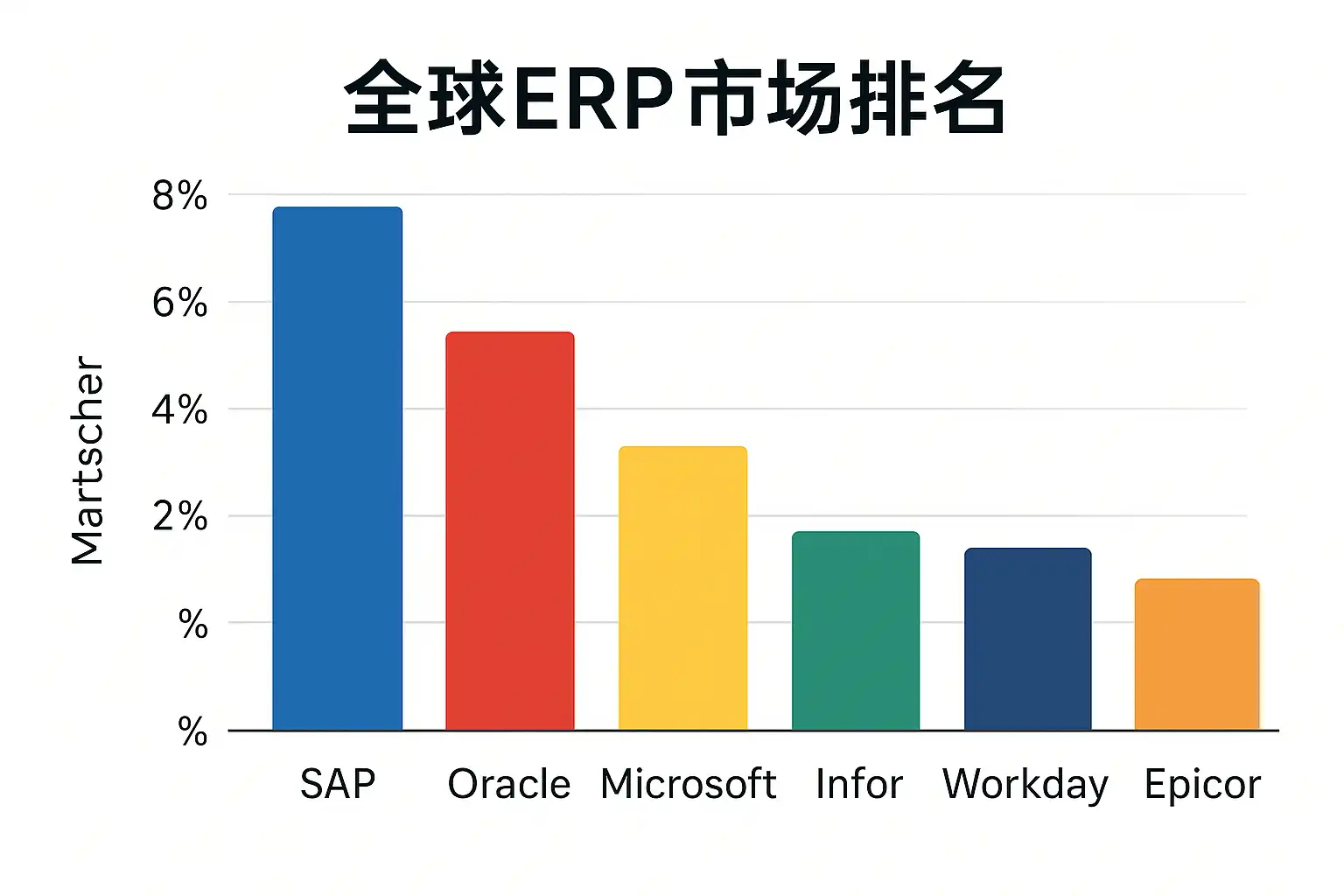 根据2023年最新全球ERP市场报告,SAP、Oracle、Microsoft Dynamics、Infor和Workday位居市场前五。SAP以市场占有率23%领先,Oracle紧随其后占18%,这些品牌因其成熟的功能和广泛的行业覆盖而备受欢迎。具体排名如下: