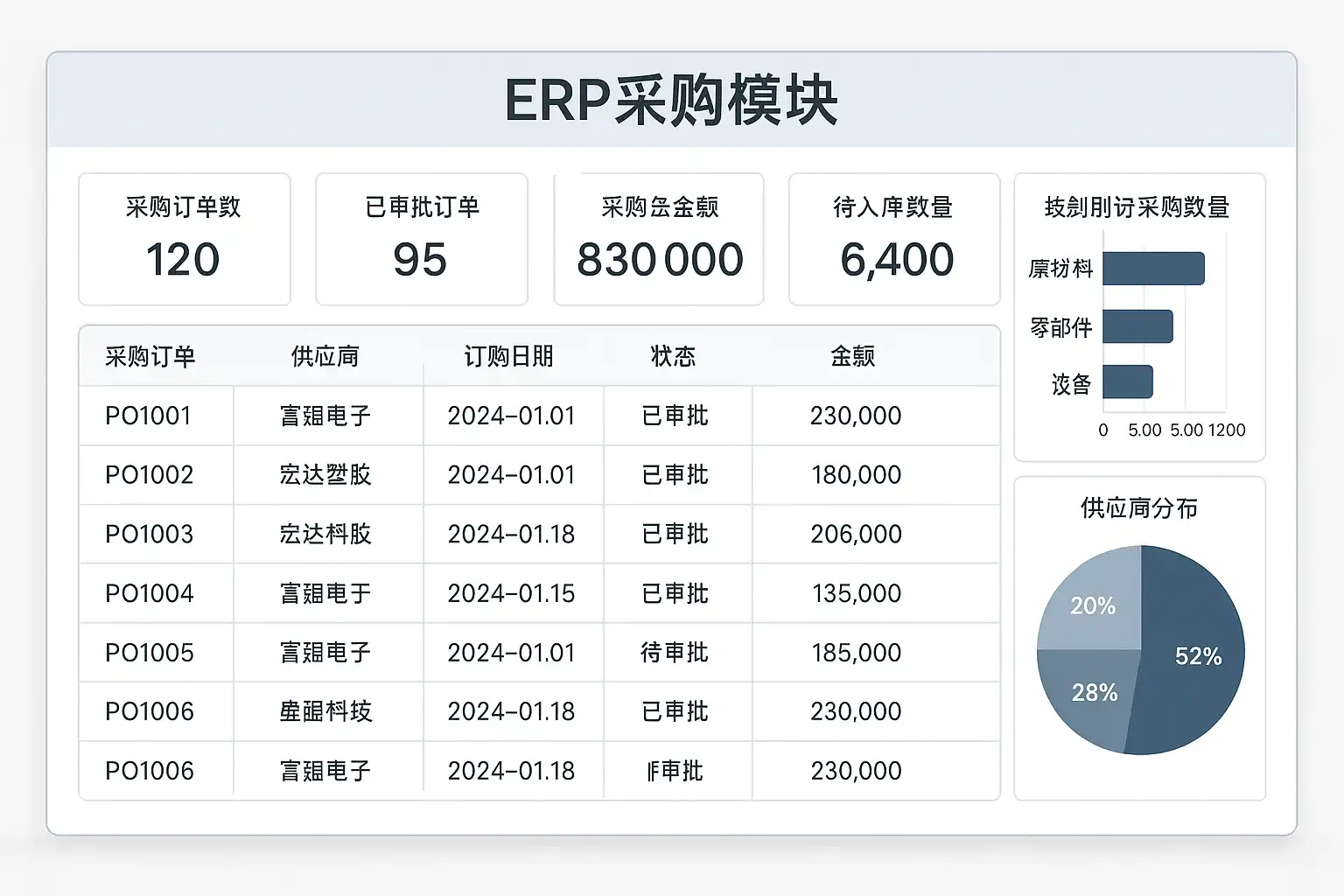 应用背景: 企业原采购流程以手工为主,数据分散在Excel与纸质单据中,导致采购周期长、数据错漏多、对账难。