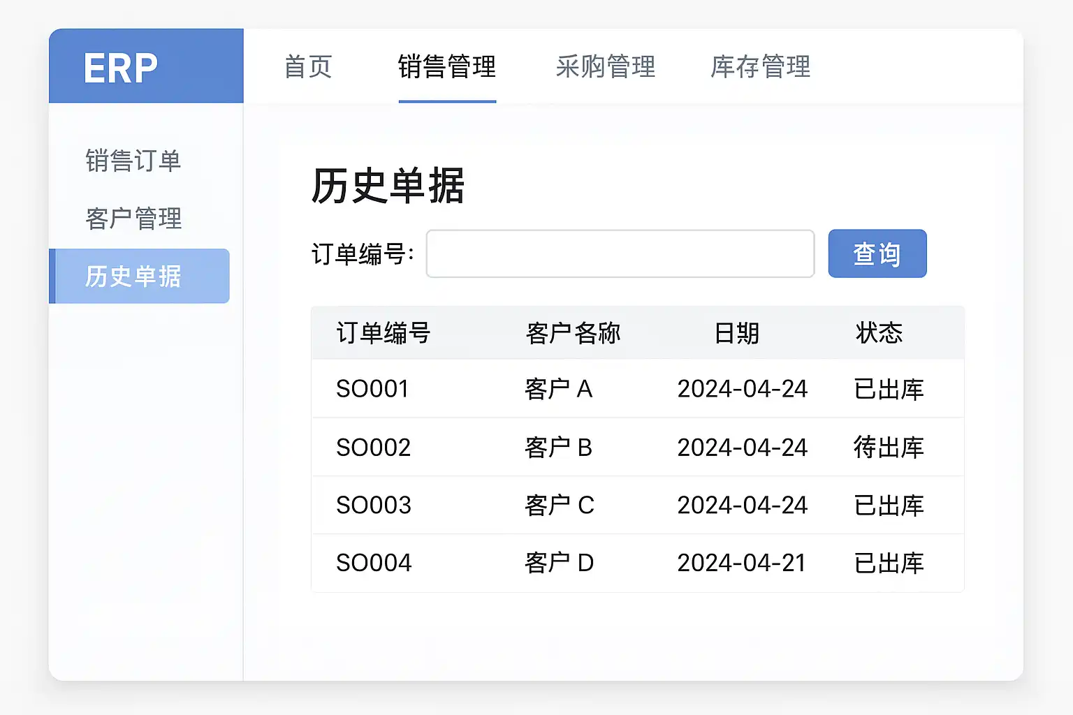 - 系统内置查询功能:大部分ERP系统提供专门的历史单据查询模块,支持按时间、单据类型、客户等多维度筛选。