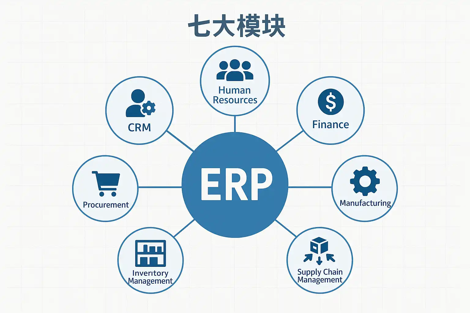 ERP七大模块通常包括财务管理、采购管理、销售管理、库存管理、生产管理、人力资源管理和客户关系管理(CRM)。