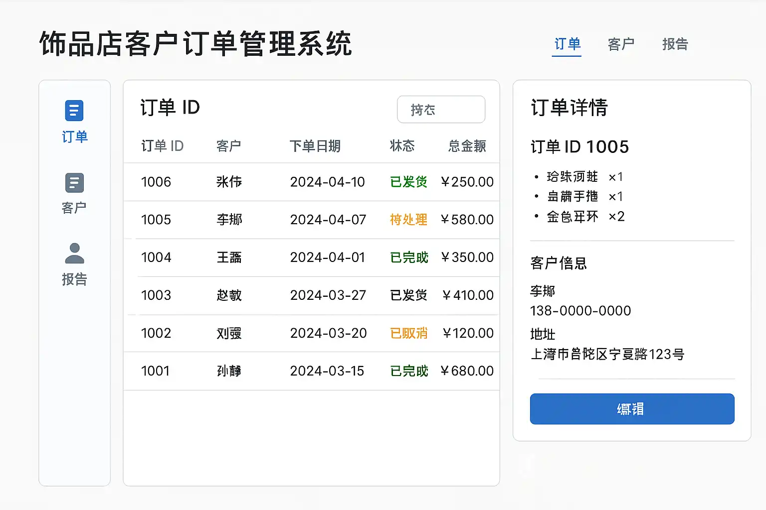 饰品店订单管理涉及客户、商品、库存、物流等多维数据。数据集中管理能有效避免信息孤岛,提高协同效率。