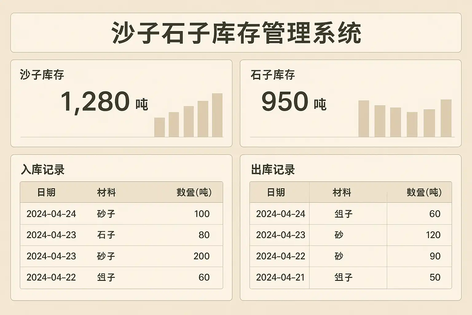 沙子石子库存管理系统的核心功能包括库存实时监控、自动补货提醒、批次管理和数据报表分析。具体来说: