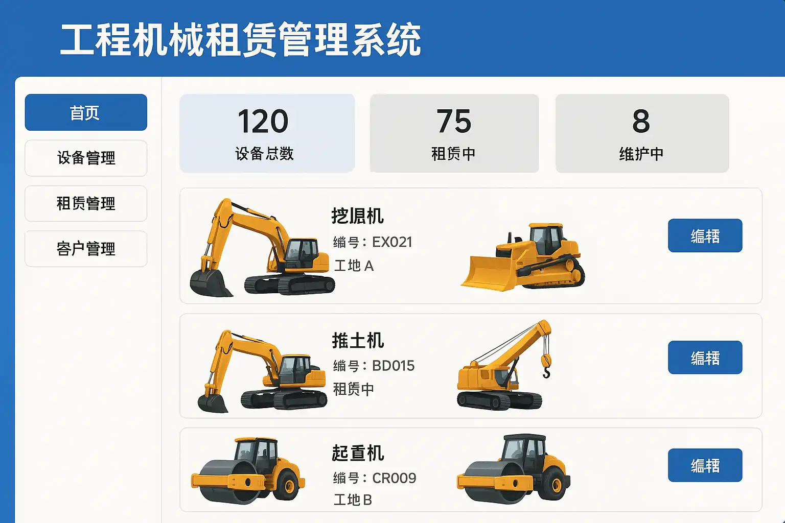- 实时设备状态监控:通过系统实时显示设备租用、归还、维修等状态,调度人员可快速安排任务。