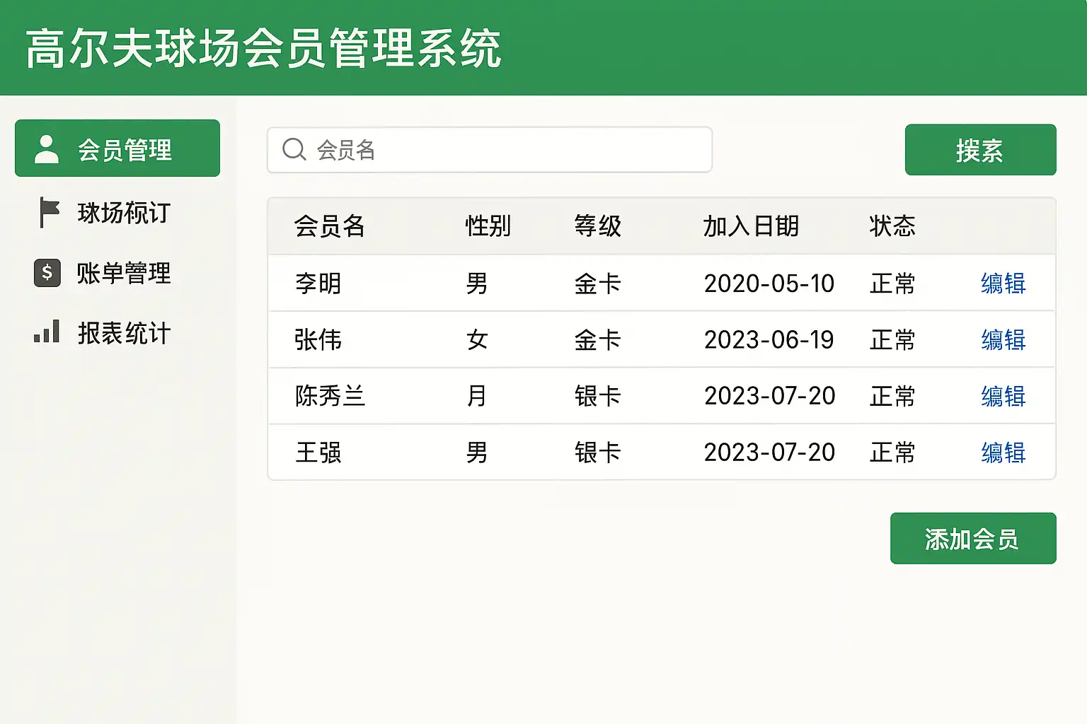 高尔夫球场会员管理系统不仅仅是会员信息的存储工具,更是提升客户体验与球场运营效率的数字化引擎。其应用场景包括会员注册、信息维护、消费记录、积分管理、活动通知、预约服务等。通过系统化管理,球场能够实现业务流程标准化、数据高效流转以及服务的个性化升级。