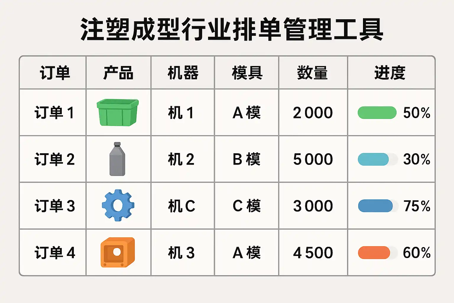 注塑成型行业面临订单多样、交付周期短、生产流程复杂等挑战。传统排单常依赖人工经验,容易出现排产冲突、资源浪费和交期延误。使用专业的排单管理工具,可以从以下几个方面提升效率: