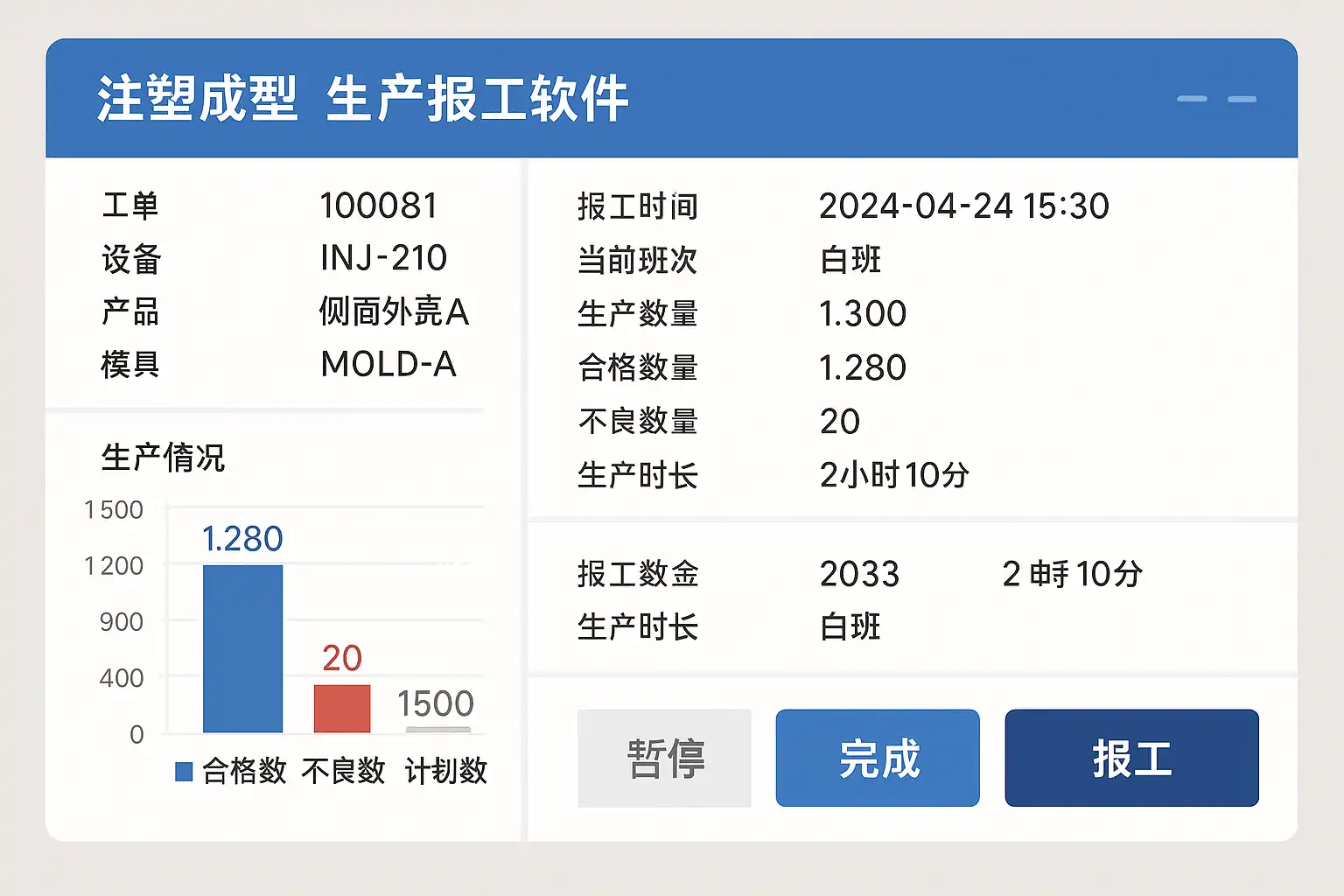 - 集成生产设备(如注塑机)PLC或传感器,自动读取生产数量、合格率、运行状态等数据。