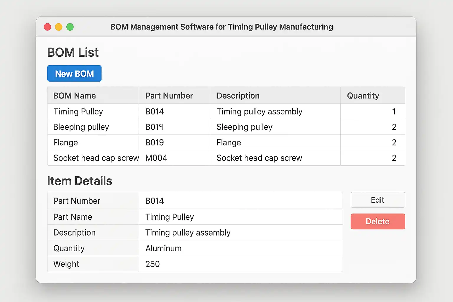 | 版本控制 | 管理BOM的不同修改版本 | 更新皮带规格时,软件自动生成新版本,确保追踪 |