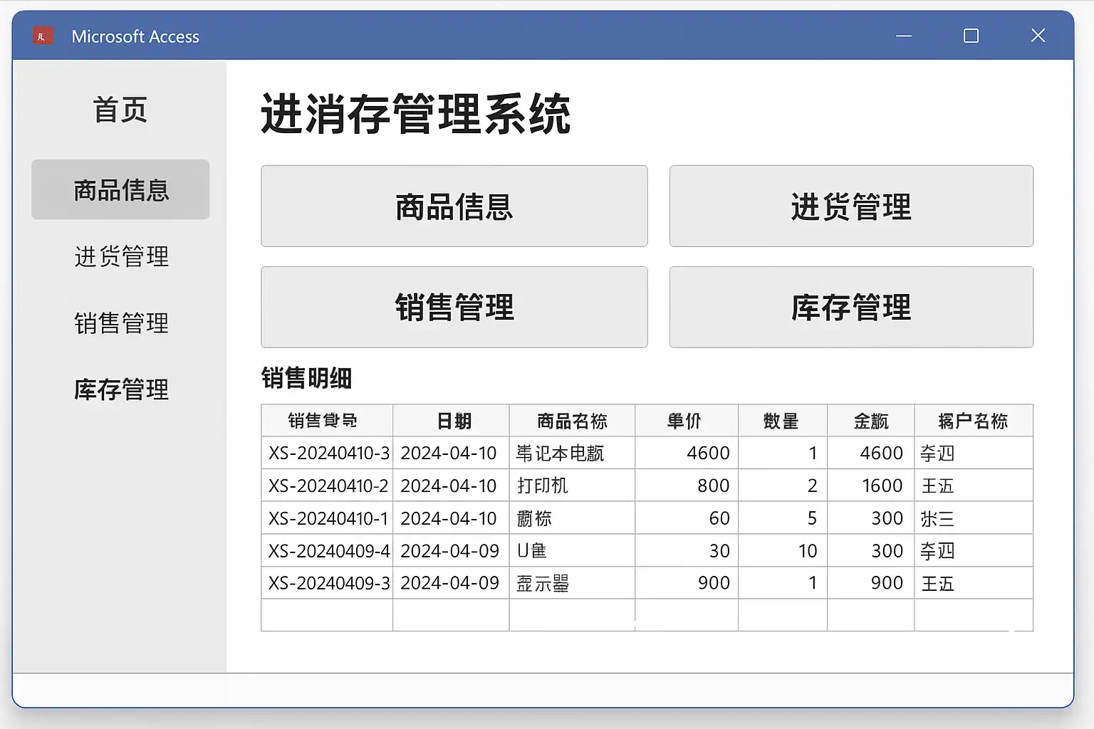 Access是一款由微软开发的关系型数据库管理系统,适用于中小企业或个人构建轻量级的进销存管理系统。借助Access,用户可以快速搭建商品、库存、采购、销售等模块,实现数据录入、查询与报表输出。