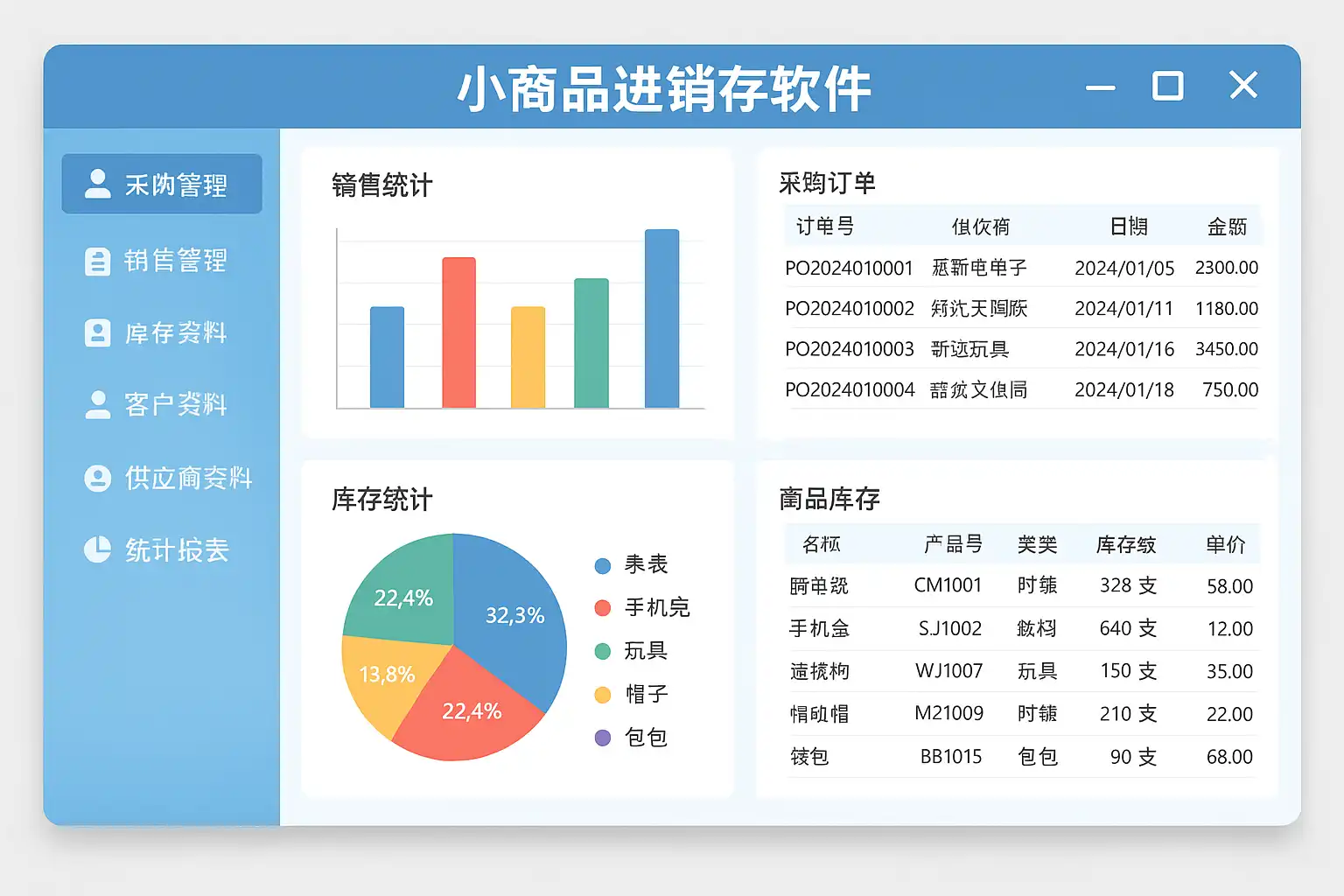 详细描述:功能全面性 对于小商品企业而言,进销存软件的功能覆盖面直接决定了其业务管理的高效性。理想的软件应当涵盖采购(供应商管理、采购订单、采购入库)、销售(客户管理、销售订单、销售出库)、库存(多仓库、库存盘点、库存预警)、财务(应收应付、对账)等核心模块。这样可以实现业务流程自动化,减少人工录入,提高数据的准确性和管理效率。