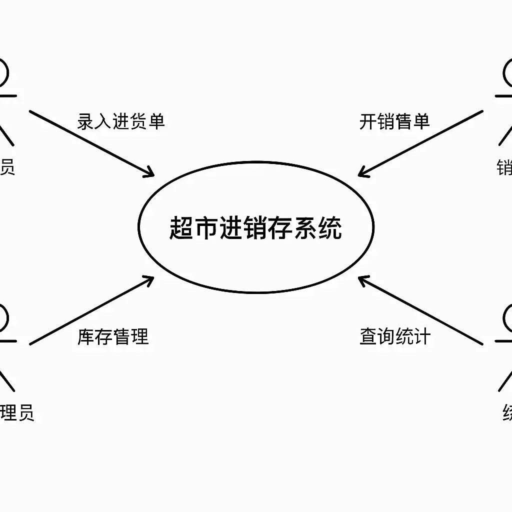 超市的进销存系统涵盖采购、销售、库存管理等模块。以下列举核心用例及其交互角色: