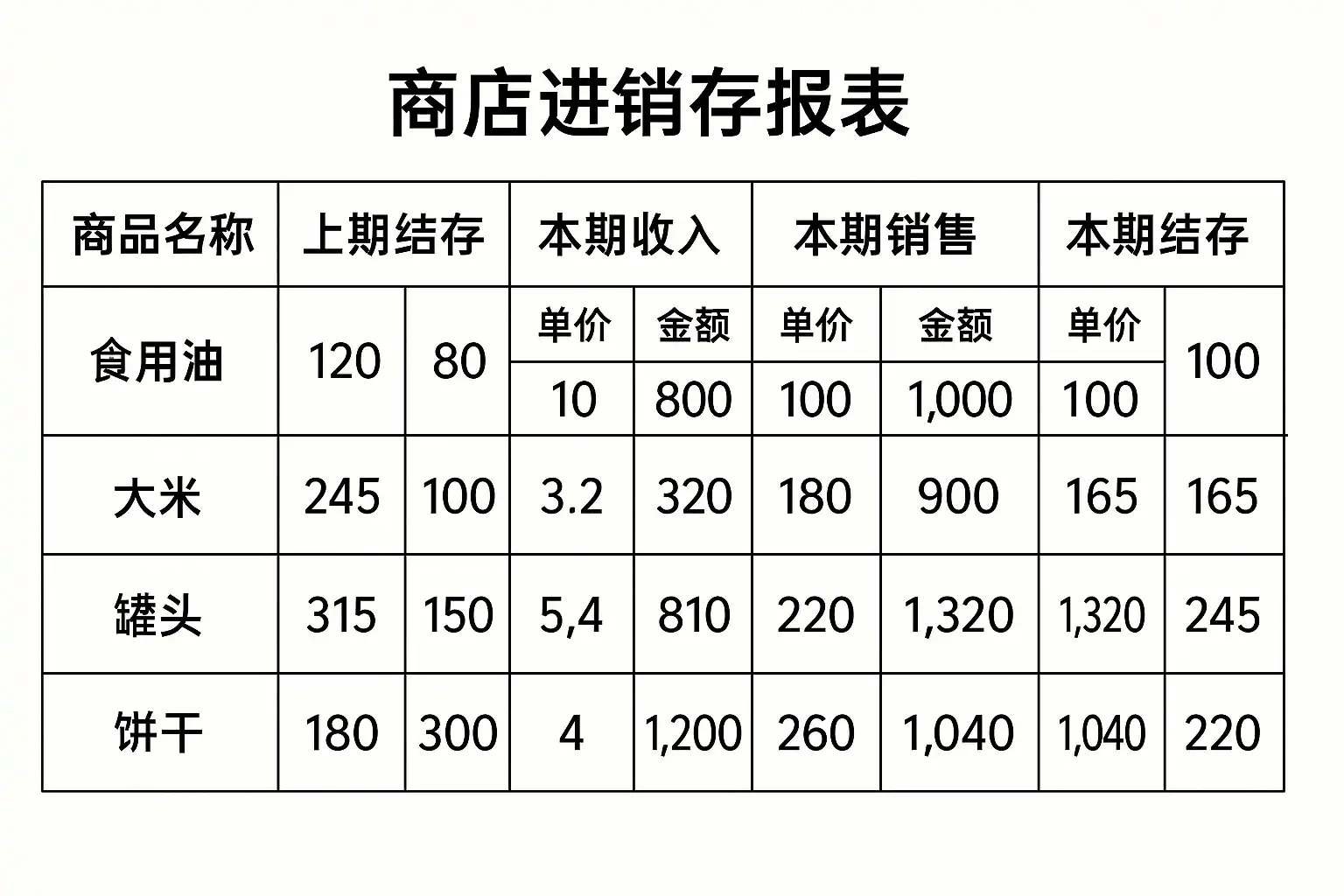 商店进销存报表是一种集采购(进货)、销售和库存管理于一体的数据汇总工具。关键数据通常包括: