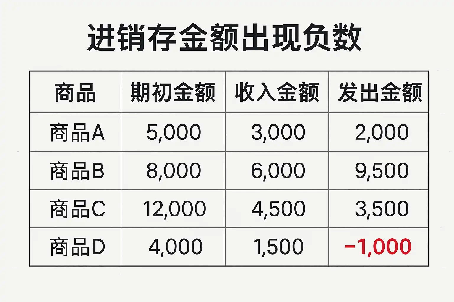 企业在日常进销存管理中,金额出现负数的情况并不少见,下面通过列表梳理常见原因: