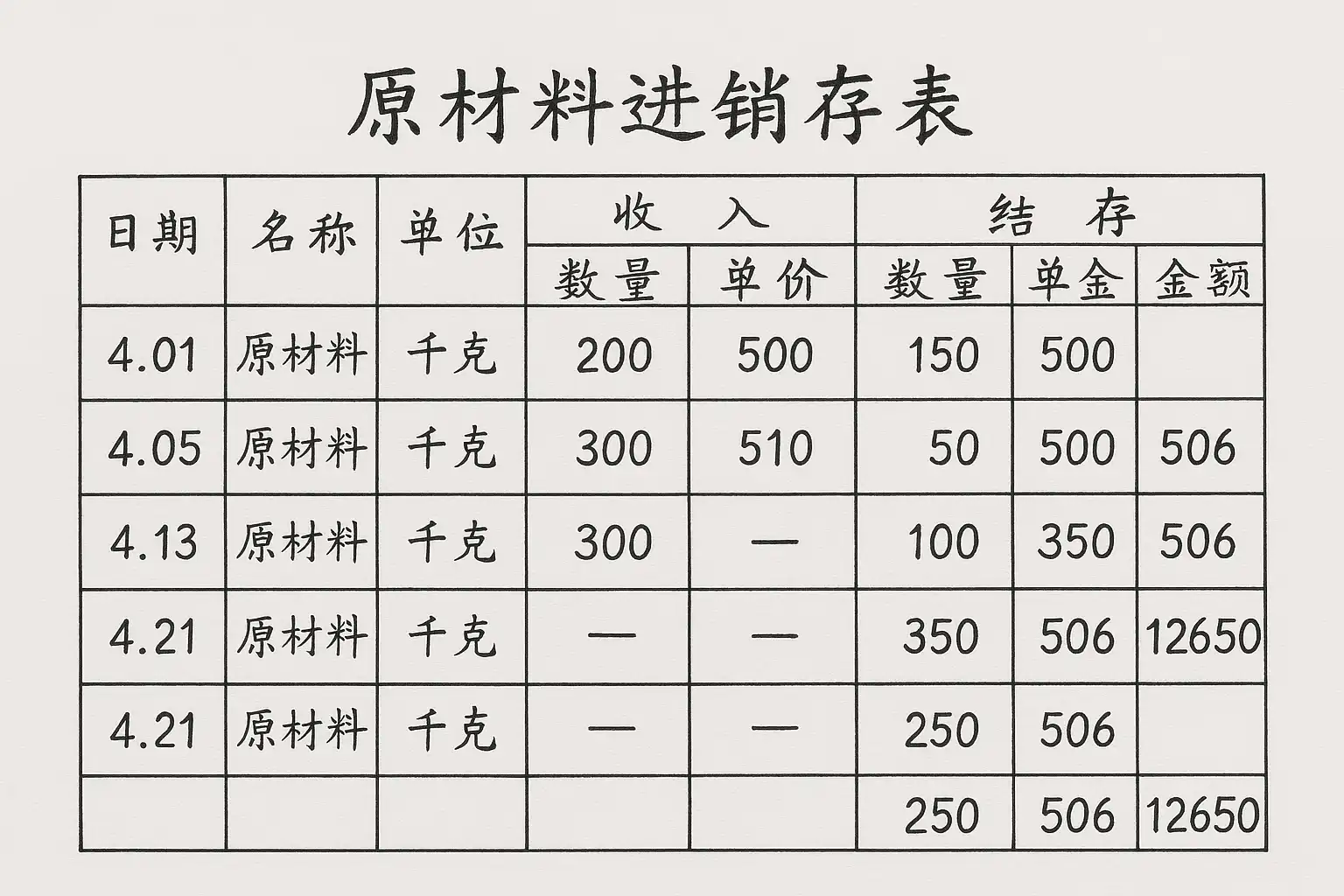 - 结存数量:指某一时间点库存剩余的原材料数量。