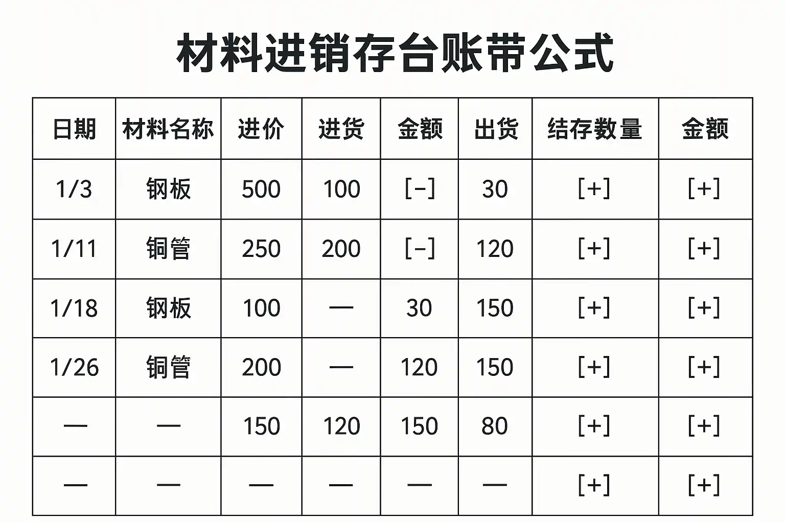 | 2024-06-01 | 钢板 | 2mm | 张 | 100 | 50 | 20 | =期初库存+入库-出库 |