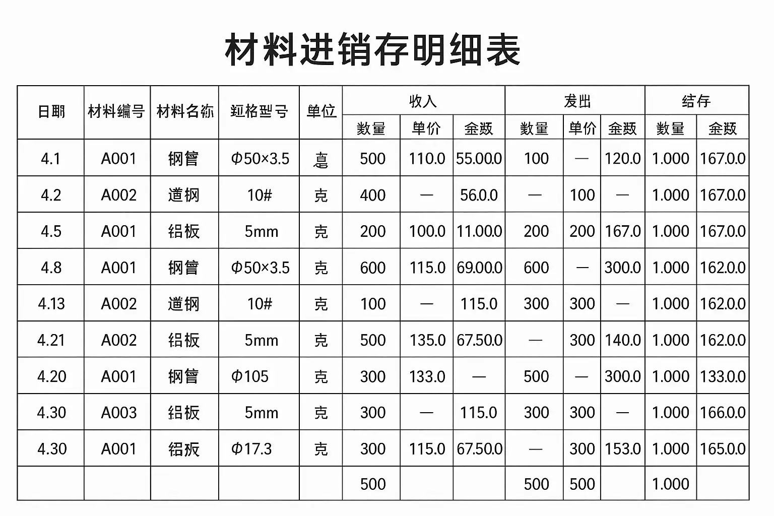 - 采用表格形式展示入库、出库、库存余额等核心数据,便于直观比较与分析。