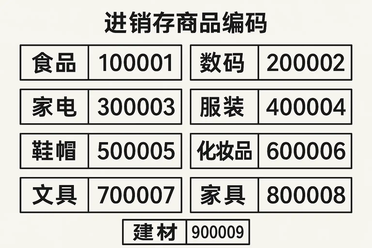 - 唯一性原则:确保每个商品编码唯一,防止重复。