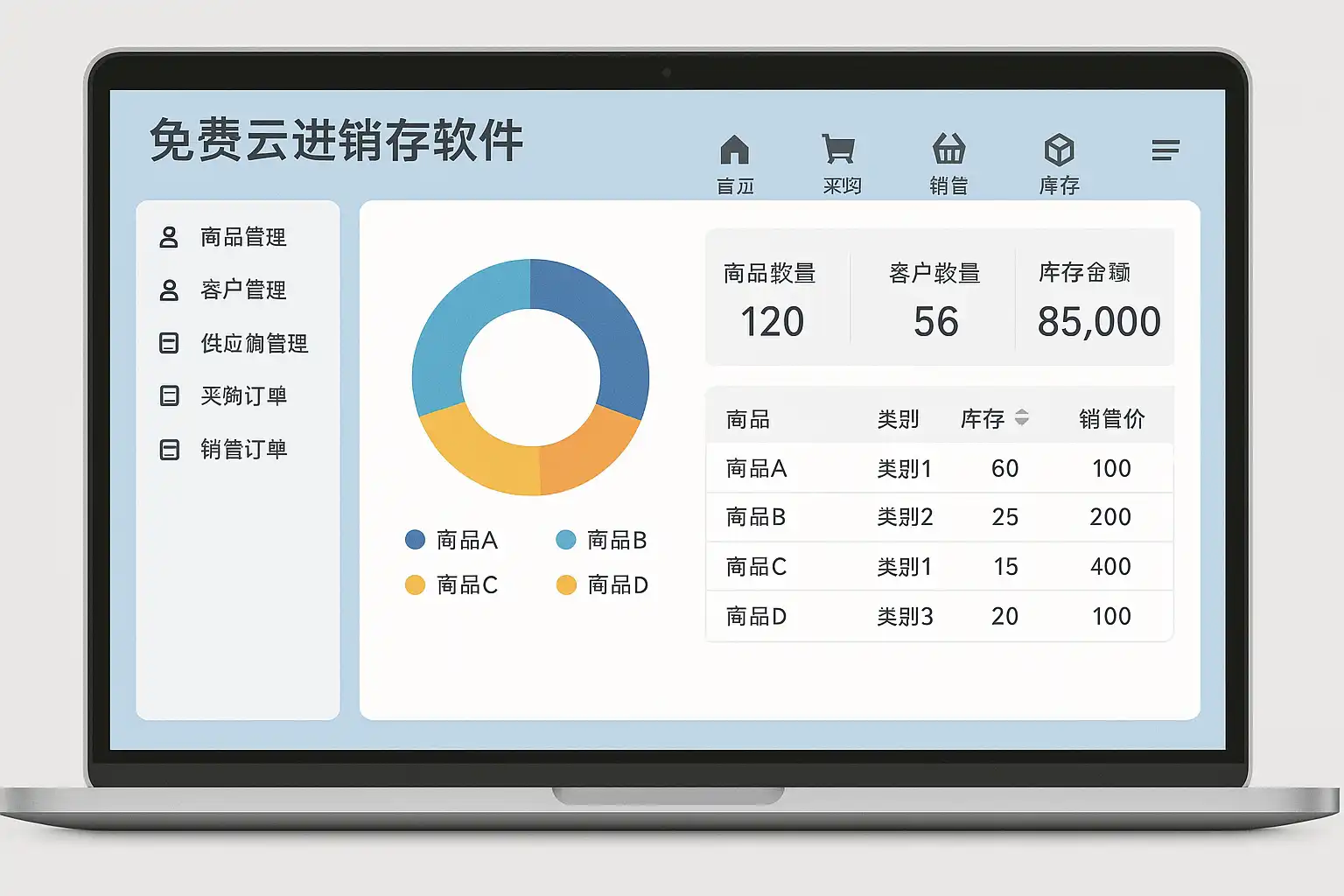 免费云进销存软件通常包含以下核心功能: