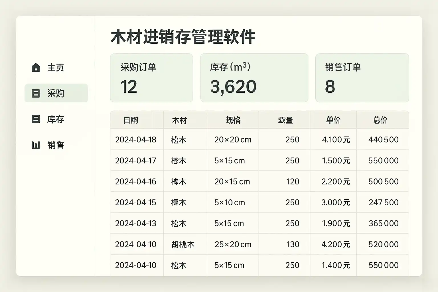 | 成本与利润核算 | 需准确核算每批次木材的成本及销售利润 |