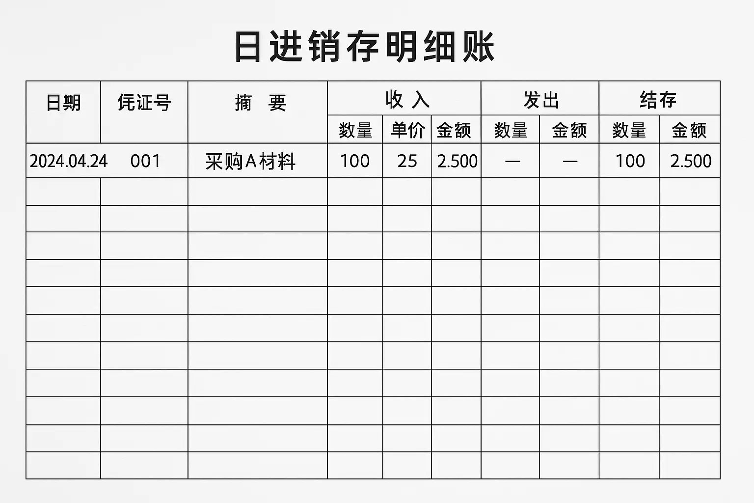 - 模板设计:建立包含日期、品名、数量、单价、金额、库存余额等字段的标准模板。