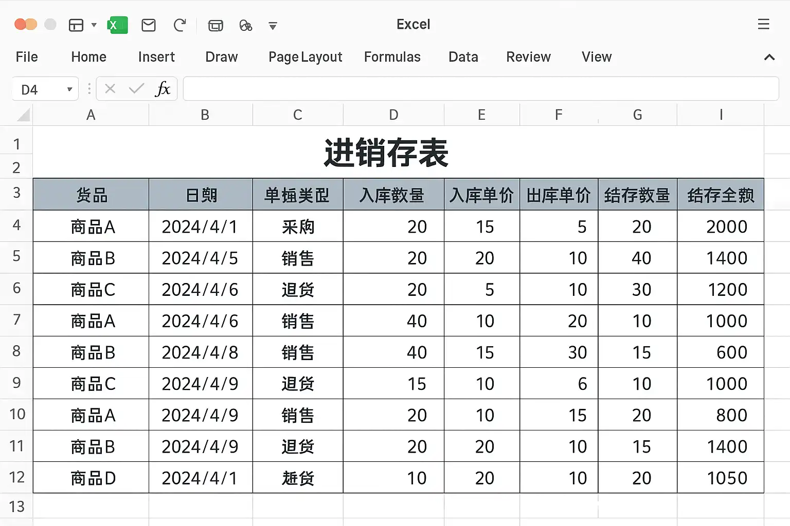 设计进销存Excel模板时,采用结构化布局非常重要: