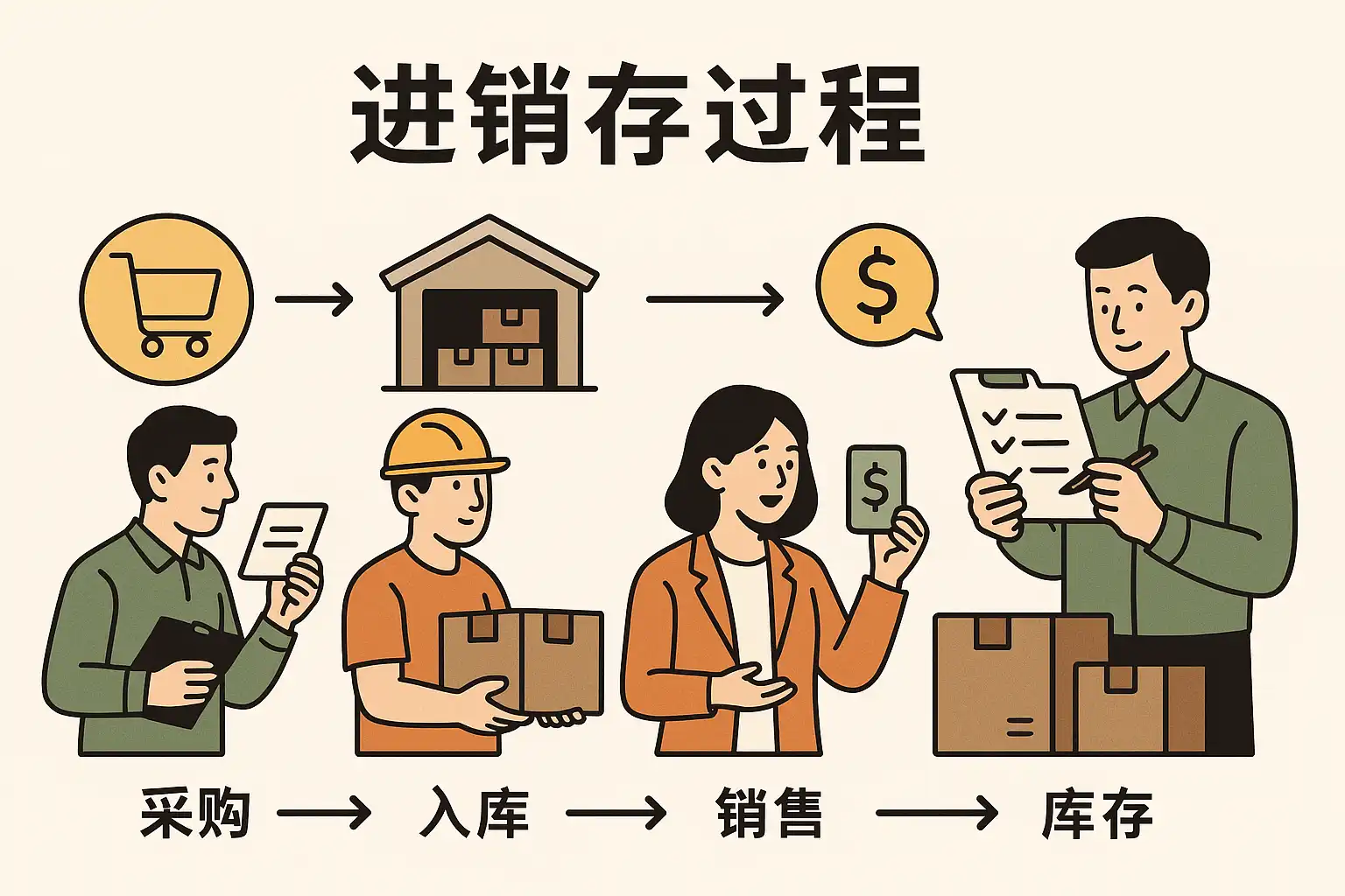进销存过程主要包含采购、入库、销售、出库和库存管理五个核心步骤。具体包括: