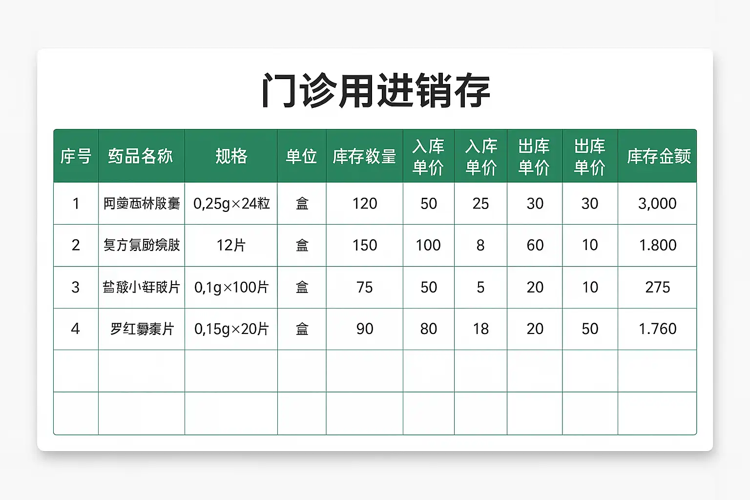 | 库存周转率 | 一定时间内库存被销售和补充的次数 | 某门诊月库存周转率为4,表示每月库存被更新4次,减少资金占用。 |