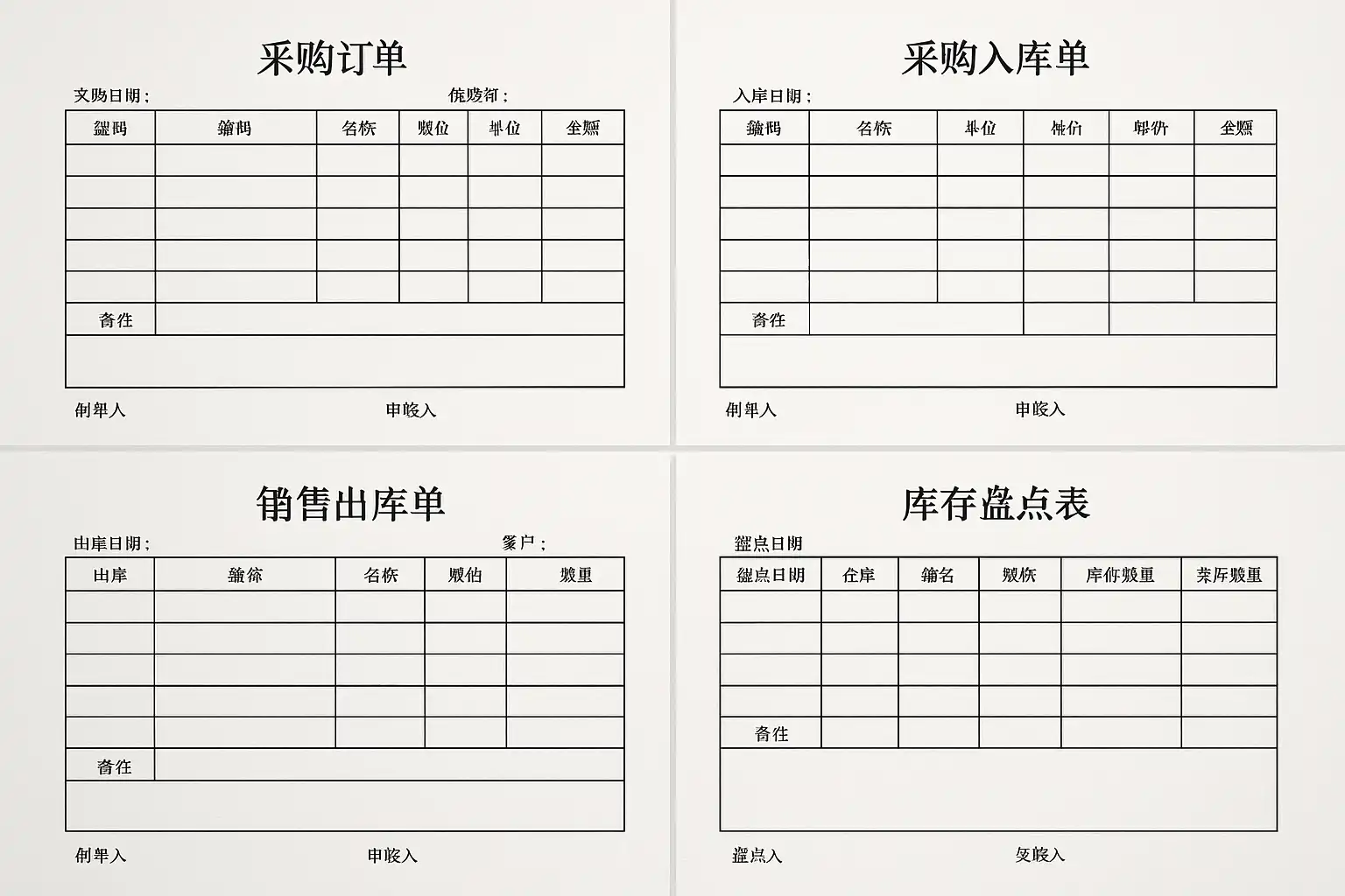 | 盘点单 | 记录库存盘点结果,核对账实差异 | 定期盘点库存,填写盘点单进行库存核对 |