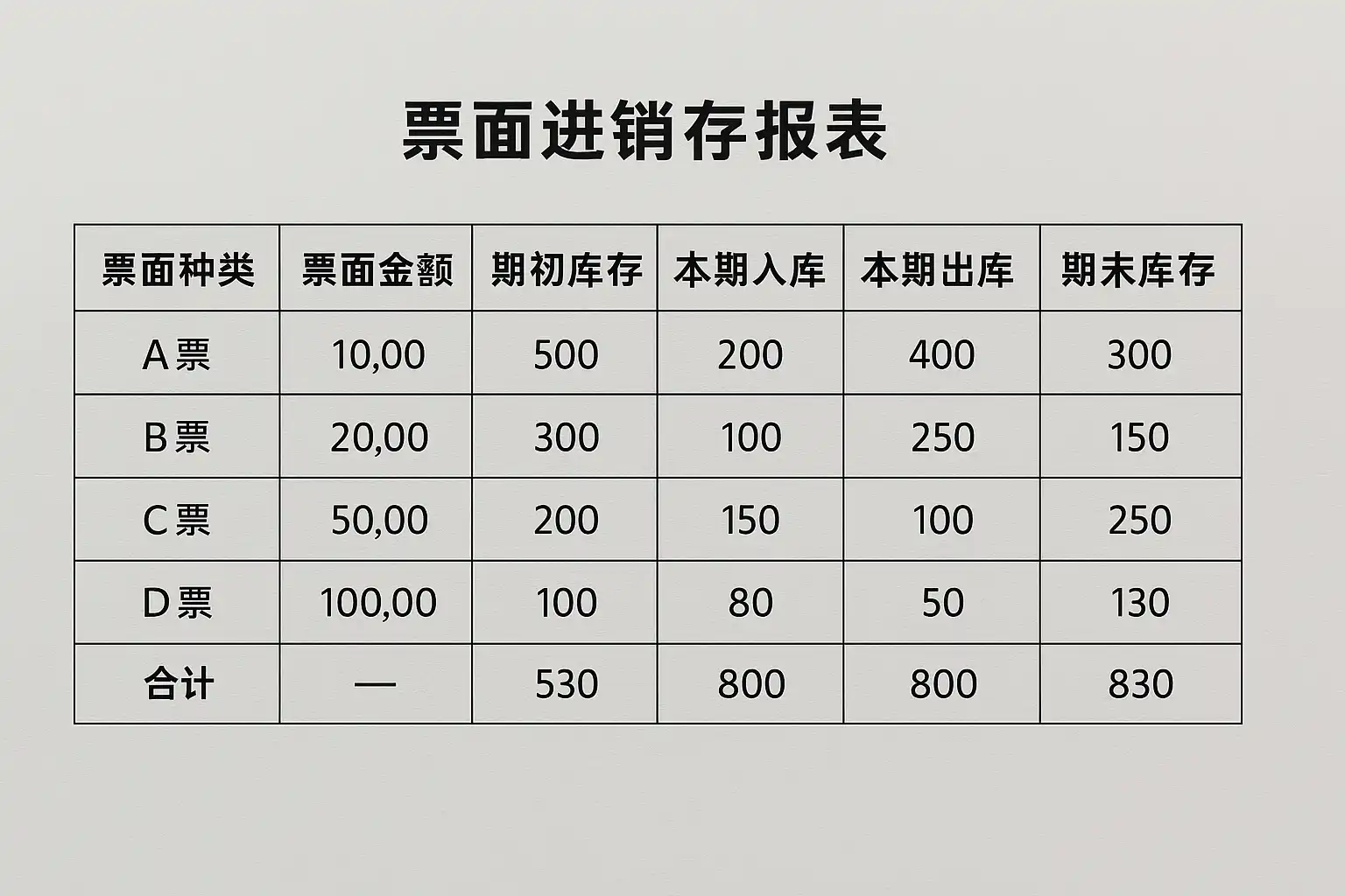 票面期末结存数量 = 期初结存 + 本期票面入库数量 - 本期票面出库数量