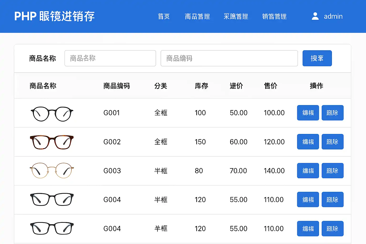 - 商品管理:支持眼镜产品分类、品牌及型号管理。
