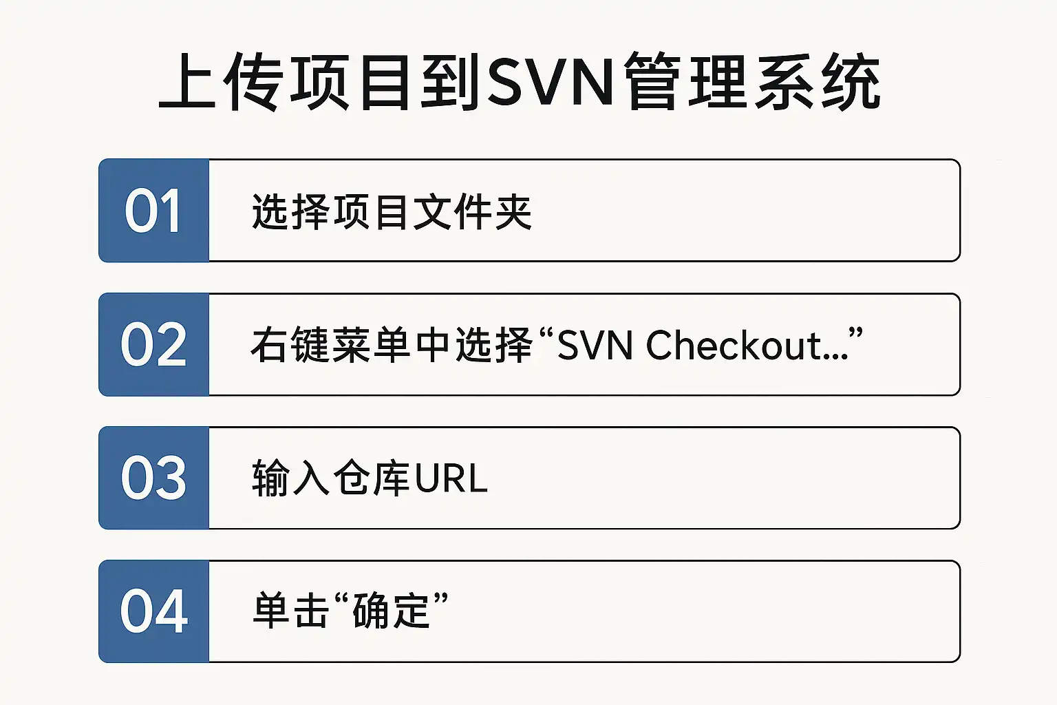 下面以实际操作为例,演示SVN上传项目的完整流程(以TortoiseSVN客户端为例):