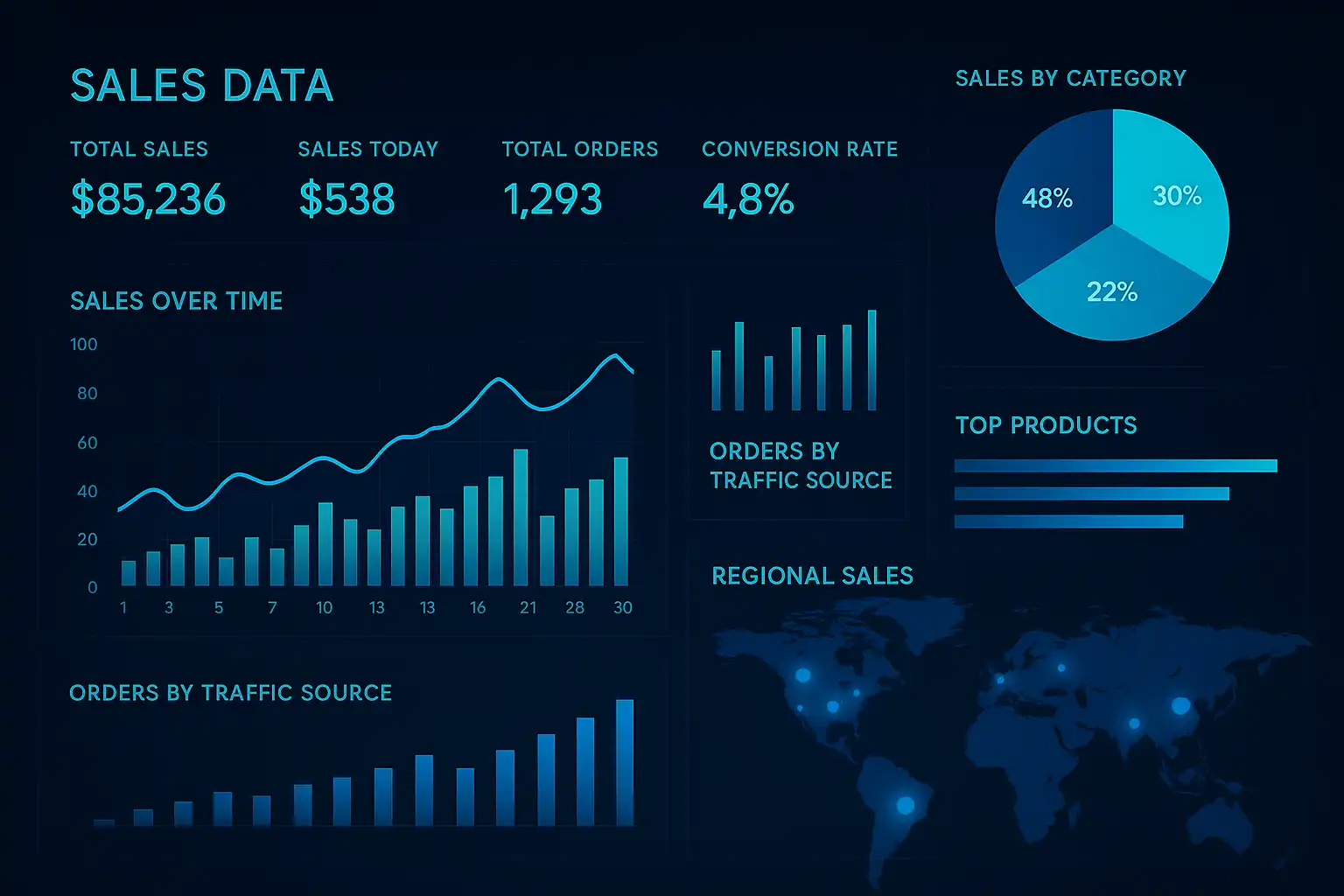 - 选择合适的可视化图表:柱状图展示销量趋势,饼图分析客户构成,地图展示区域销售分布。