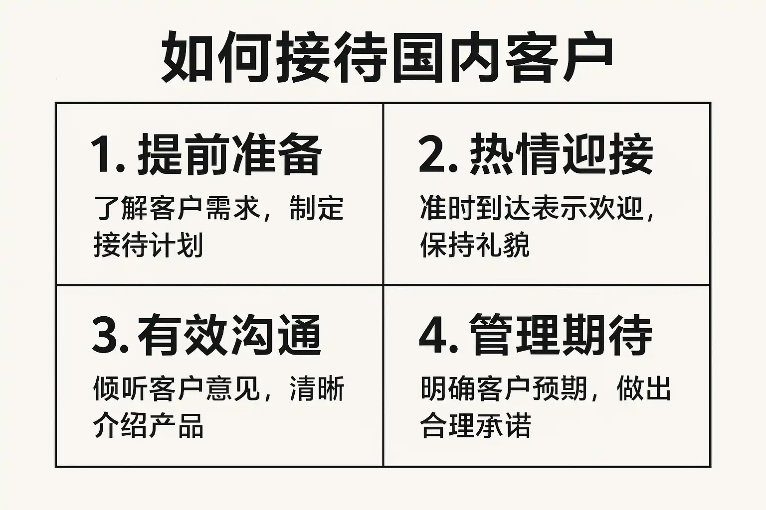 - 个性化服务:根据客户背景定制接待方案。