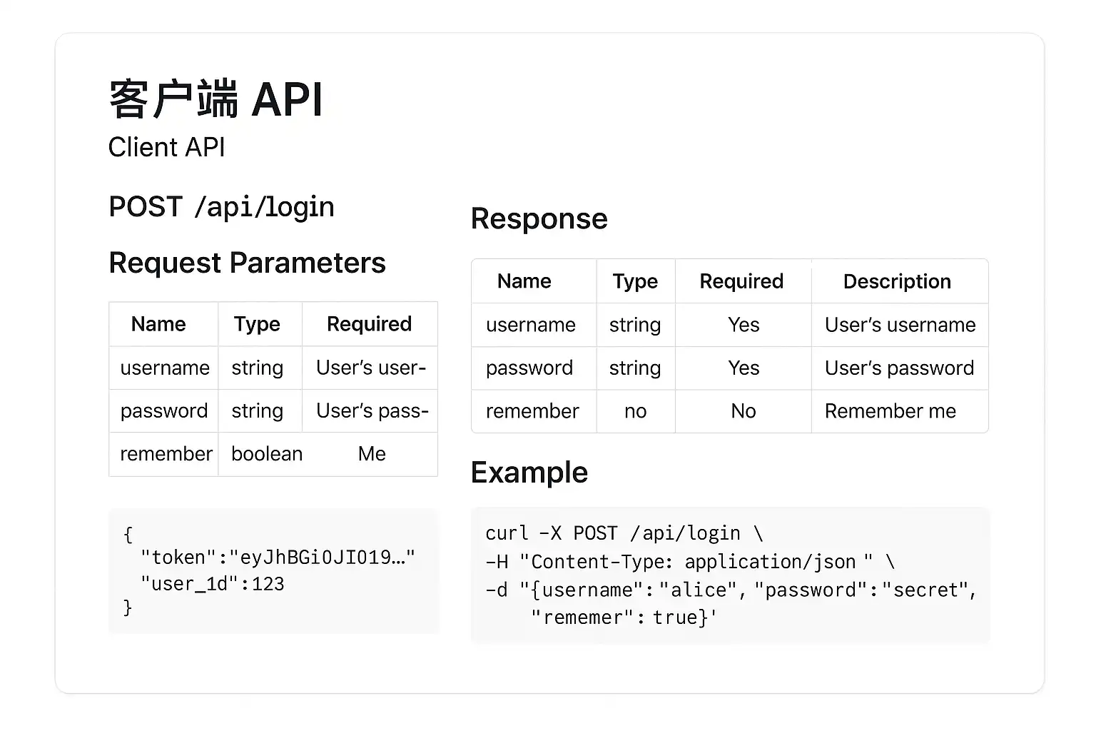 请求示例:POST /api/user/login\{"username": "alice","password": "123456"\}