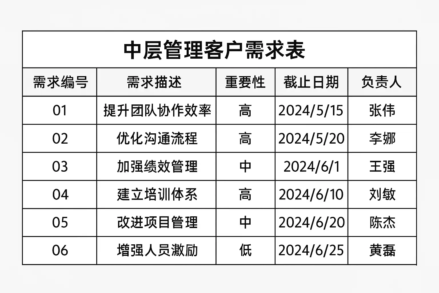 中层管理客户需求表的核心结构通常包括以下几个部分: