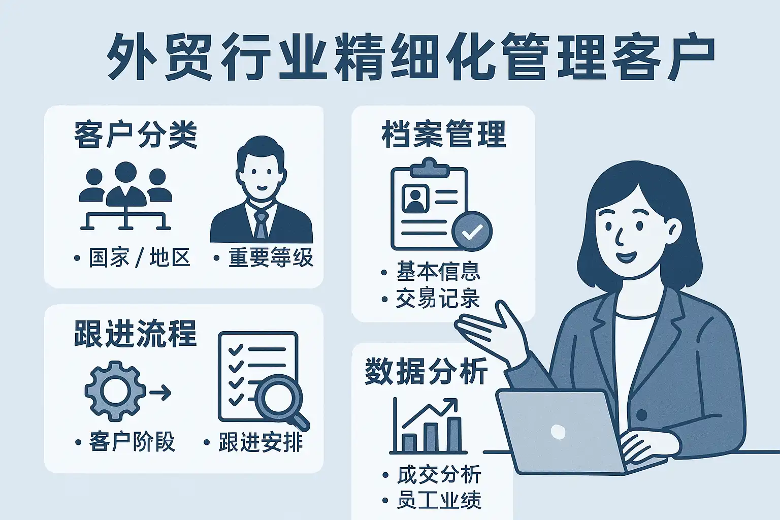 趋势展望: 未来,随着AI、大数据等技术深入应用,外贸企业客户管理将更趋智能化、自动化。企业应持续关注客户需求变化,借助先进工具实现精细化、差异化、个性化的极致服务体验。