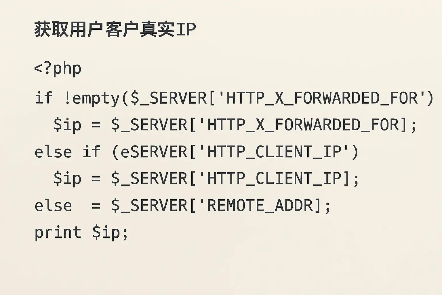 - 优先读取$_SERVER[‘HTTP_X_FORWARDED_FOR’],并解析多个IP,通常第一个IP为真实客户端IP。