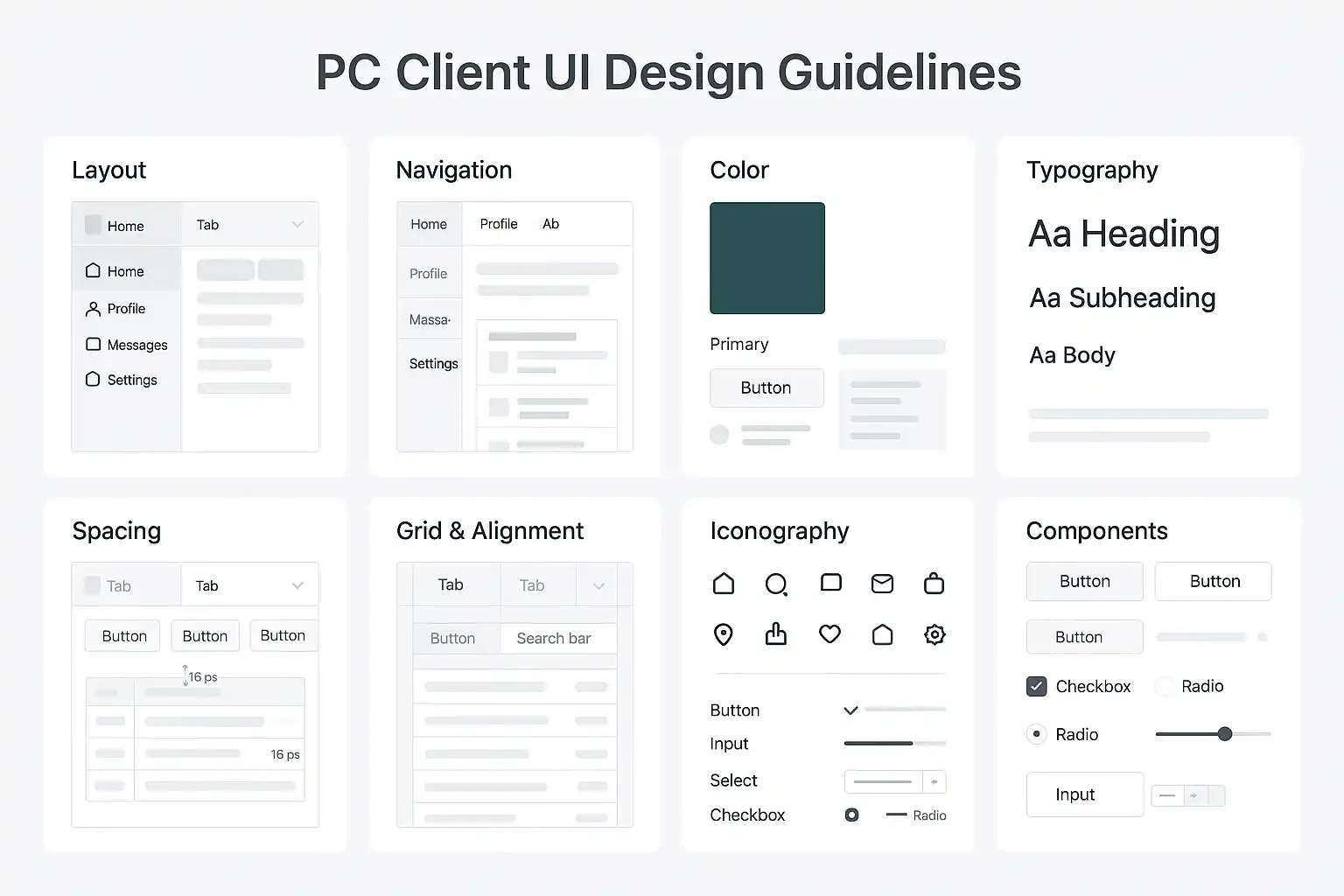 PC客户端UI设计规范指的是一组指导软件界面设计的标准和规则,旨在确保界面美观、实用及一致,为用户提供流畅的操作体验。UI设计规范不仅涵盖视觉元素(如颜色、字体、图标、排版等),还包括交互模式、响应逻辑和布局标准。