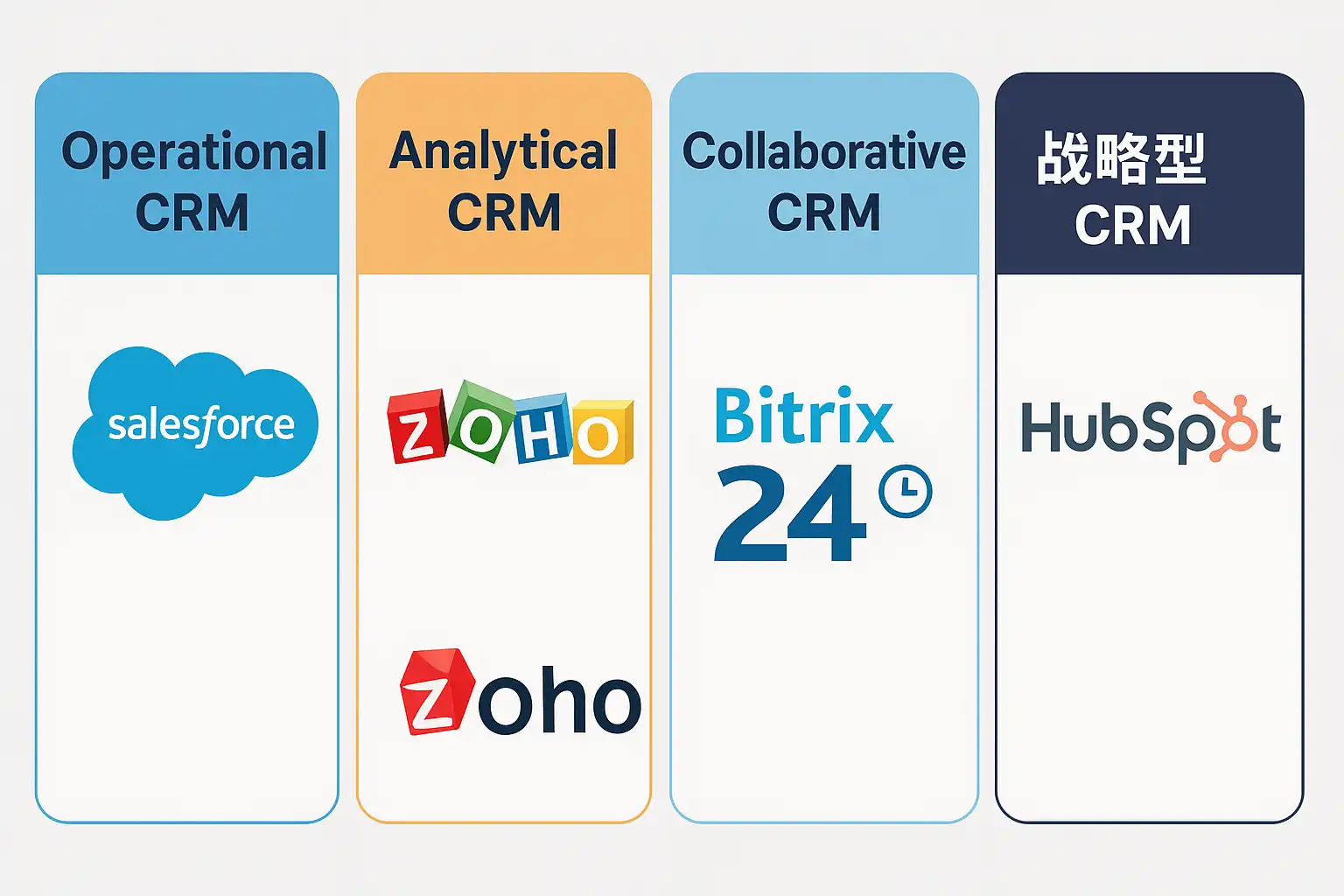 | 中型企业 | 混合型(操作+分析) | 灵活扩展、数据分析和自动化 | Zoho CRM、Salesforce |