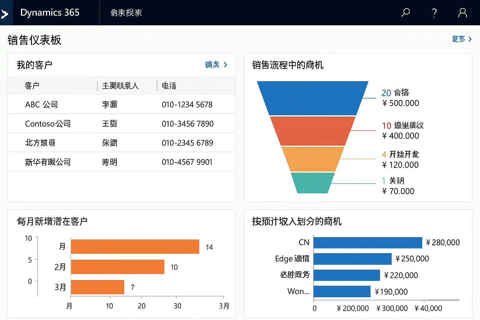 微软CRM系统内置强大的数据分析和可视化工具,支持企业优化客户管理和销售策略,主要体现在: