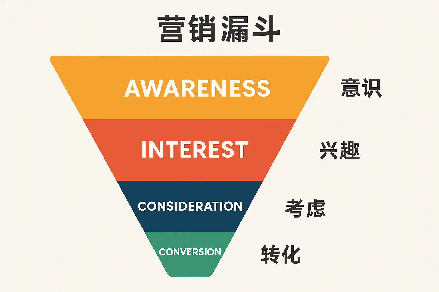营销漏斗是企业在市场活动中,用于引导潜在客户逐步完成购买行为的模型。其核心在于将大量潜在用户通过不同环节筛选,最终转化为忠诚客户。营销漏斗阶段一般分为以下四步: