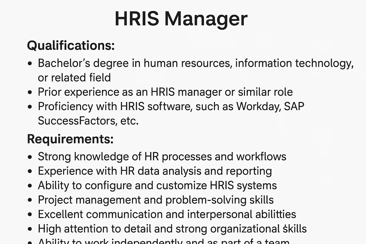 - 技能要求:熟悉主流HRIS软件(如SAP SuccessFactors、Workday)、数据库管理及数据分析能力。