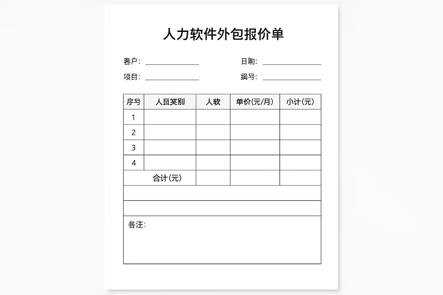 综合上述要点,一个标准的人力软件外包报价单模板结构如下:
