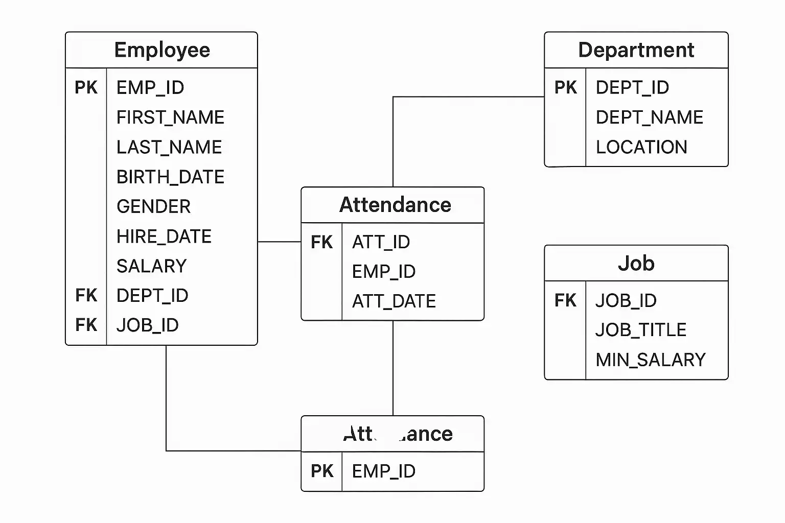 | 考勤表 | 考勤ID、员工ID、日期、出勤状态 | 关联员工表 |