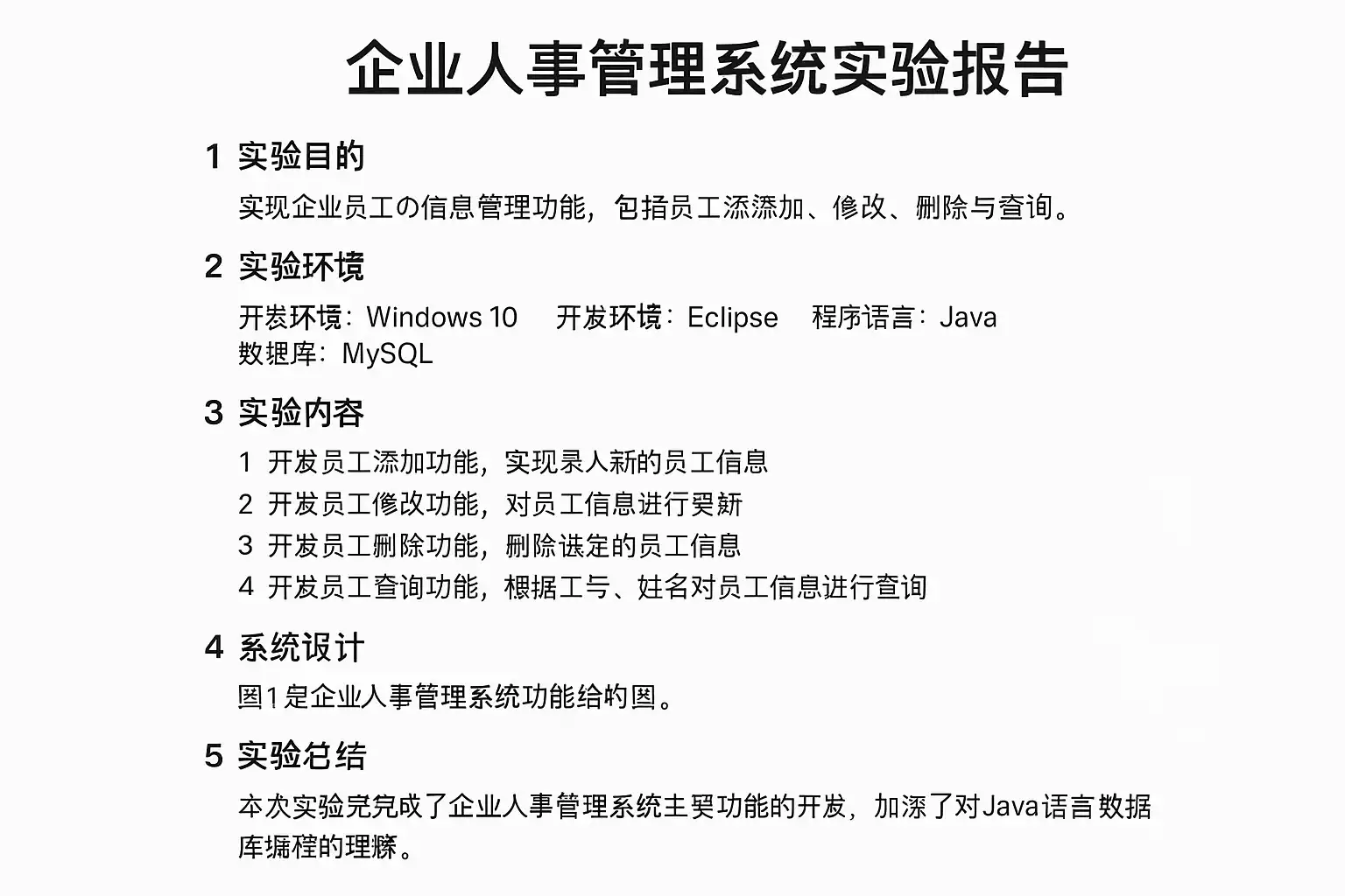 我在撰写企业人事管理系统实验报告时,常常不知道如何合理安排内容结构,想知道怎样的结构才能让报告更清晰且符合规范?