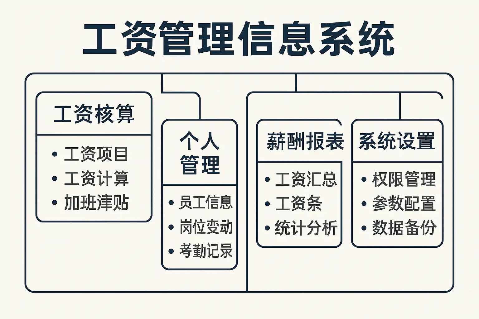 我最近在了解工资管理信息系统,想知道它具体包含哪些关键模块?这些模块分别负责什么功能,能帮我理清系统架构吗?