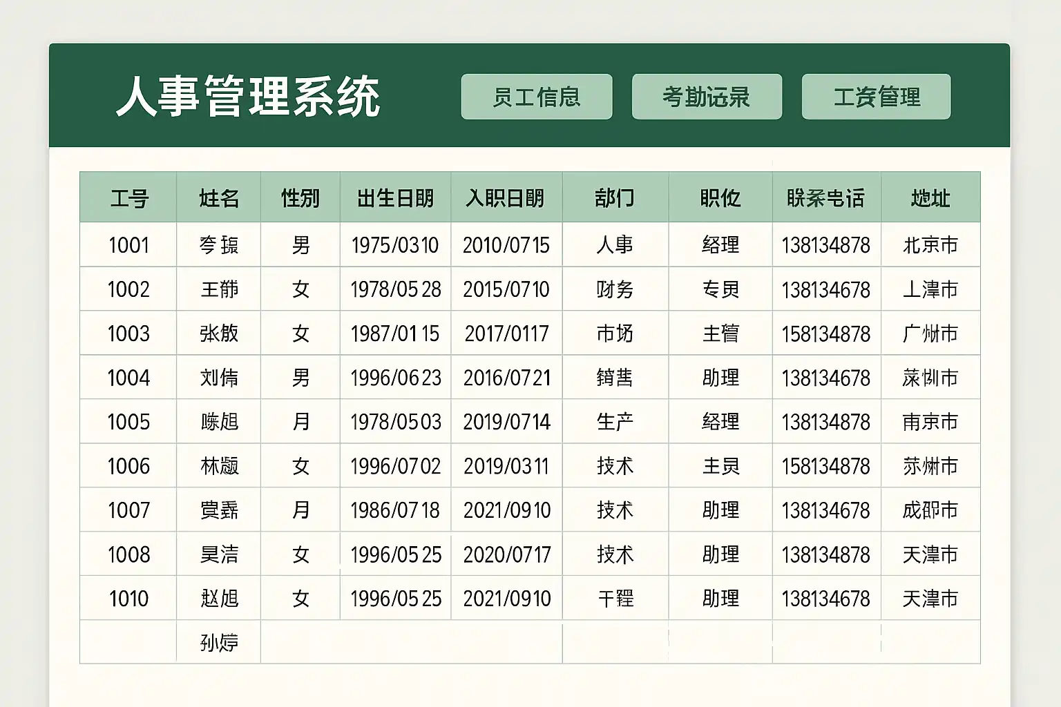 - 基本字段:员工编号、姓名、性别、部门、岗位、联系方式、入职日期等。