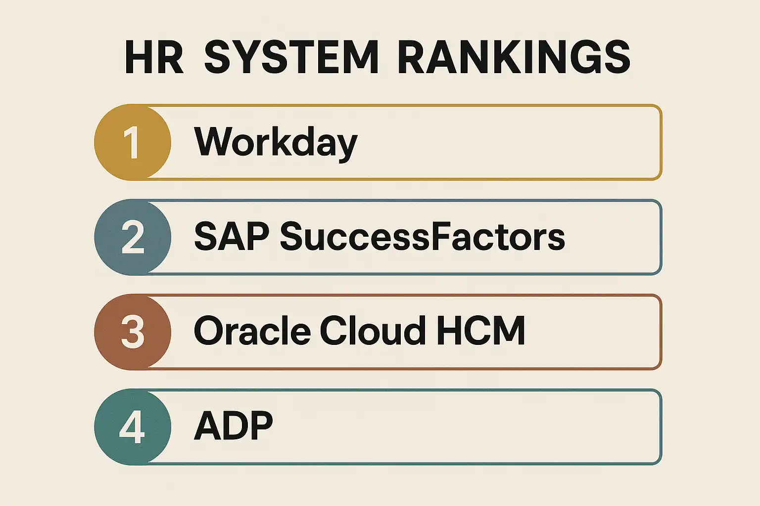 上述排名综合考虑了系统的功能、用户体验、安全性、支持服务以及全球适用性。Workday、SAP SuccessFactors和Oracle HCM Cloud位居前三,反映出大型企业在全球化、数据集成与自动化方面的高度需求;而BambooHR、Gusto等则更适合中小企业,凭借易用性和高性价比赢得市场。