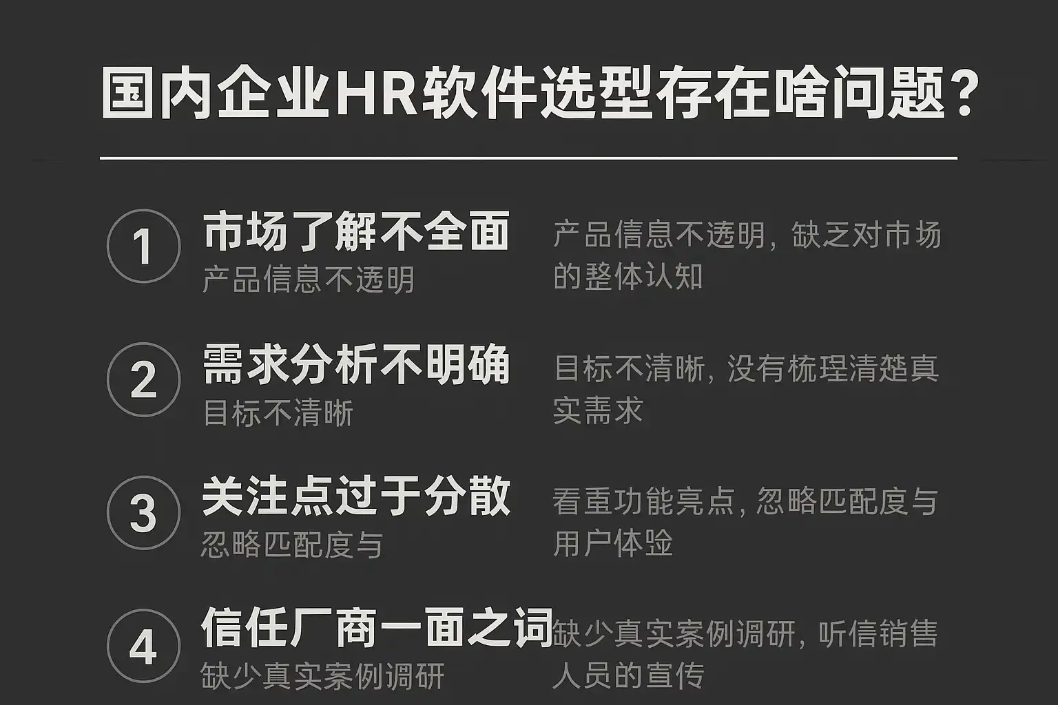 国内HR软件市场竞争激烈,供应商数量众多,产品质量与服务能力差异显著。企业在选型时,常常面临以下困惑: