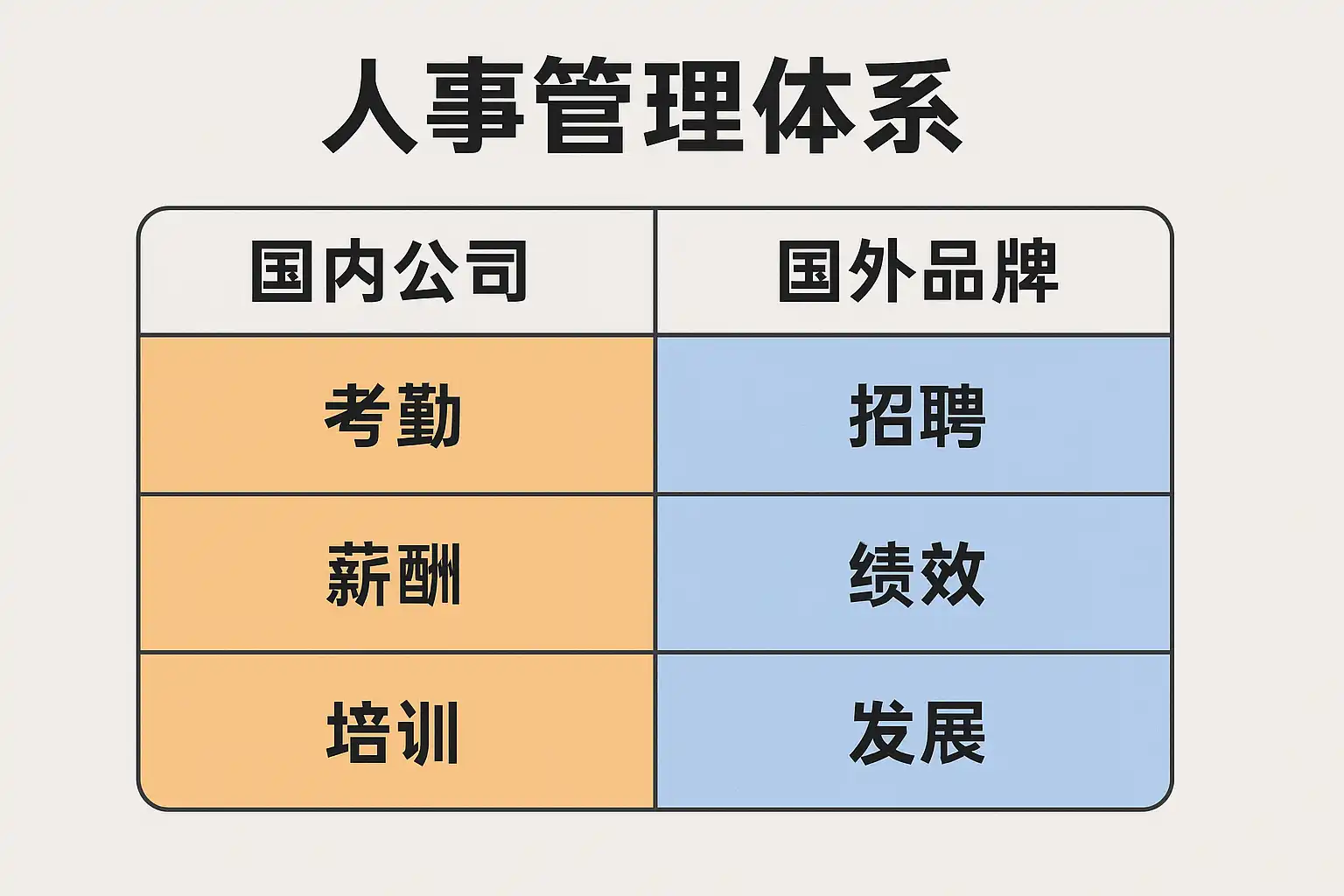 人事管理体系国内外对比主要体现在以下几个关键差异: