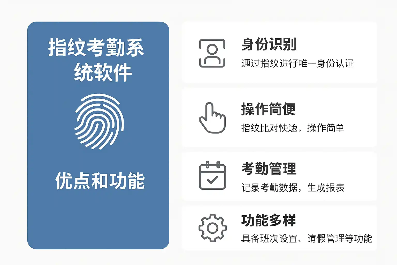 | 精准识别 | 指纹唯一性强,误差率小,杜绝冒名打卡 |